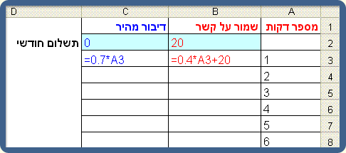 רשמו בתא B3 בטור של חברת"שמור על קשר" 20+0.4xA3=