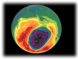 | החור באוזון מגלים את החור! בשנת 1980 דיווחה תחנת המדידה המטאורולוגית הבריטית, אשר נמצאת ביבשת אנטארקטיקה (בקוטב הדרומי של כדור הארץ) על ירידה חדה בריכוז האוזון בסטרטוספרה. בצילום לווין נראה ה"חור באוזון" מעל אנטארקטיקה (האזור הכהה)